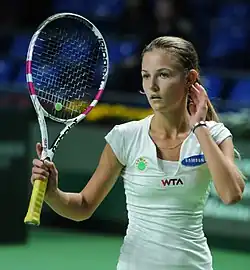 Kalinskaya started the year as a top 200 player, making her major debut in qualifying at the Australian Open. Her first opponent was Swiss top seed Stefanie Vögele, to whom she lost in a three-set match.[16] She was handed a wildcard to the main draw of the St. Petersburg Ladies' Trophy, and was beaten by Australian Daria Gavrilova in the first round.[17] In early March, at the Malaysian Open, she recorded her first tour-level main-draw win, defeating French top-30 player Caroline Garcia in straight sets.[18] Still finding her way to the top 100, she had to play ITF events as well. She played in China at two 60k tournaments: first destination was Zhuhai where she was eliminated in the first round by former top-10 Swiss player Patty Schnyder before she headed to Shenzhen where she reached semifinals, but lost to compatriot Ekaterina Alexandrova.[14][note 1]