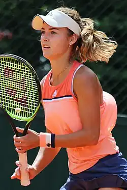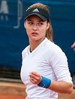 Kalinskaya started the year with a triumph at the 25k Playford International, defeating Elena Rybakina in the final.[26] Her victories continued with three more, first qualifying for the Australian Open. As a result, she advanced to the main draw, but was defeated by the world's No. 11, Aryna Sabalenka, in the first round.[27] She struggled to reach the WTA Tour main draw at many tournaments, including the Premier-level St. Petersburg Ladies' Trophy, Qatar Ladies Open and Stuttgart Open. In the middle of May, she won the 60k Open Saint-Gaudens, defeating Romanian Ana Bogdan in the final.[28] While still in France, Kalinskaya tried enter the main draw of the French Open, the only major where she still had not succeeded. However, for the third year in a row she failed to qualify.[14][note 1]