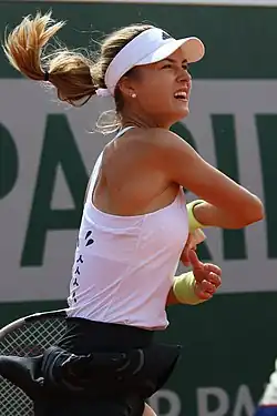 At the next three tournaments, Kalinskaya made progress. Ranked at No. 100, she defeated three better-ranked players at the Abierto Zapopan in Guadalajara, Mexico, and reached the semifinals. In the semifinal match against Stephens, she won the first set against the eventual champion, but retired after the second set when her opponent made a turnover.[47] The second good result came at the Indian Wells Open, where she won two qualifying matches and achieved main-draw wins against two French players, Harmony Tan and Alizé Cornet. Despite winning the first set against Romanian Sorana Cîrstea in the third round, she lost another two sets, winning only one game.[14][note 1] The same situation happened again at the Miami Open, where she reached the third round after qualifying, but this time she did a walkover before the third-round match against Lucia Bronzetti. Previously, in the second round, she defeated the world's No. 6, Karolína Plíšková, to notch her second top-10 win.[48]