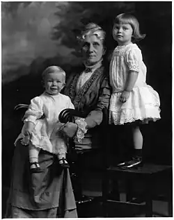 On her way back to Canada, she met her son Louis again, after nineteen years of separation. He had returned to Siam in 1881, having had become an officer in the Siamese royal cavalry and a teak trader. From his marriage to Caroline Knox — a daughter of Sir Thomas George Knox, the British consul-general in Bangkok, and his Thai wife, Prang Yen[60]— he had two children, aged two and five years. After the death of his wife, he entrusted them to his mother, who took them with her to Canada, while Louis returned to Siam.[54]