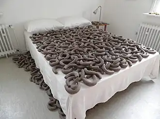 Maiolino now lives and works in São Paulo, Brazil. In 2010, Maiolino had different art works from the past 30 years of her career displayed in an exhibition ('Continuum') at the Camden Arts Centre in London, England.[2] One of the installations, made entirely from clay, is a symbol of everyday tasks, the individual, language and society. She created the piece by hand, rolling and molding the clay into 100 different shapes.[2] More recent solo exhibitions include 'The Matrix 252', which is a selection of videos that use the body to express life when ruled by an oppressive government and 'Affections' (2014).[8]