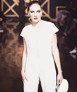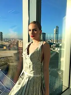 She starred as Hrysa, a teenage rock singer who turns into a rock star, in Nikos Zervo's Show Bitch in 2010.[3] It premiered at the Thessaloniki International Film Festival.[18][12] From there, she starred in a number of TV shows and films including Ever Been to the Moon?,[22] and appeared in magazines such as Cosmopolitan, Marie Claire and Esquire.[2][17] In 2015, she filmed Dance Fight Love Die: With Mikis On the Road, a docu-fiction film by Asteris Koutoulas about composer Mikis Theodorakis.[23][24][6][25] The film premiered at the Hof International Film Festival in 2017 and was released in theaters in 2018. Mikis Theodorakis and George Dalaras praised her performance. In 2016, she hosted the first annual Hellas Filmbox festival awards ceremony in Berlin, the city's first-ever Greek film festival.[26][27][28][29] The following year, she portrayed supermodel Kate Mosscowitz in Victoria Larimore's Open House.[23]