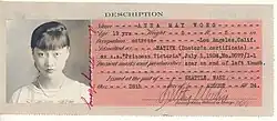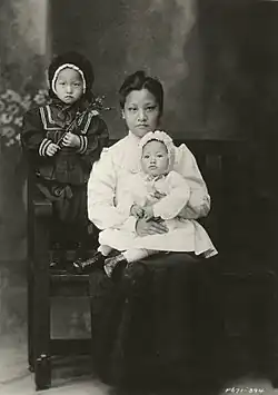Wong's parents were second-generation Chinese Americans; her maternal and paternal grandparents had arrived in the U.S. no later than 1855.[14] Her paternal grandfather, A Wong Wong, was a merchant who owned two stores in Michigan Bluffs, a gold-mining area in Placer County. He had come from Chang On, a village near Taishan, Guangdong Province, China, in 1853.[15] Anna May's father spent his youth traveling between the U.S. and China, where he married his first wife and fathered a son in 1890.[16] He returned to the U.S. in the late 1890s and in 1901, while continuing to support his family in China, he married a second wife, Anna May's mother.[17] Anna May's older sister Lew-ying (Lulu) was born in 1902,[14] and Anna May in 1905, followed by six more children: James (1907–1971), Mary (1910–1940), Frank (1912–1989), Roger (1915–1983), Marietta (1919–1920), and Richard Wong (1922–2007).[18]