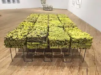 Rosen's work in the first half of her career reflected her traditional ceramics training and—particularly after the move to California—an interest in nature.[37][2] It ranged from tall ceramic outdoor sculptures to slashing geometric black-ink drawings to thick, plate- and tile-based slabs that sprouted dense, vertical accumulations of modeled organic forms.[41][2][42] In the latter works, critics noted affinities with historical architectural ornamentation—della Robbia's terra-cotta plaques, decorative aspects of Gaudi and Louis Sullivan, or the swarming statuary of Hindu temples—as well as with geological cross-sections.[42][38][2] Sample (1999) is a representative piece, consisting of a roughly 10' by 16' grid of squares, dense with squirming, tentacular forms stacked in two layers and elevated on a steel stand.[38][37] Maria Porges deemed the yellow-glazed work "a baroque, feminist-inflected riposte to Carl Andre's dour modular floor pieces: nature's fecundity riffing on the sometimes-humorless dryness of Minimalism."[2]