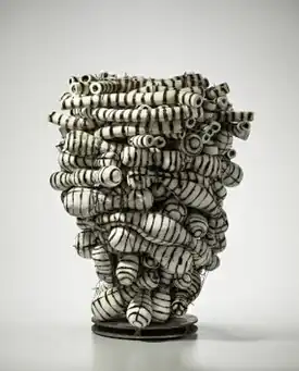 In the mid-2000s, Rosen turned to more loosely composed pieces she called "mash-ups" and "bundled constructions," which ranged from pedestal- (e.g., Squill, 2006–7) to human-sized.[40][36] Reviewers noted the wide range of natural and cultural associations the sculptures conjured—scholars rocks and garden gnomes, barnacles proliferating on rocks, beehives, alien plants or ritual objects.[36][1][39][6] The larger works typically consisted of numerous, individually modeled biomorphic elements, piled and bound together with wire or rubber strips and seemingly about to topple, which were held upright by tall metal armatures resting on casters, like wheel carts.[1][43][39] Their rounded, globular forms—alternately wormlike, bulbous, knobby, vegetal or organ-like—were often glazed in vivid shades of green and yellow, and in some cases intertwined with black and white tubular shapes in notably asymmetrical assemblages.[1][2][6]