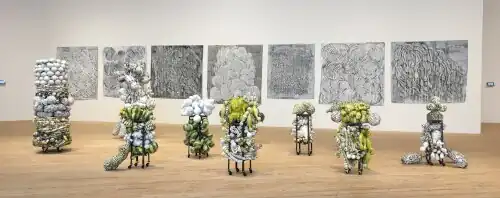 Kenneth Baker wrote that pieces such as Bunny (2011)—a dense cluster of writhing forms capped by a tuberous yellow figure—exhibited "a pitch of comic grotesquerie" making them appropriate "emblems of a culture in which voiceless instinct expresses itself as excess—of accumulation, consumption, impulsiveness or power."[43] In 2014, David Cohen characterized such works as "monumentally goofy tours de force of constructional complexity and formal singularity [with] sculptural personae that are as defiantly present as they are elusive or ambivalent to characterize."[36] He and others likened their surprisingly animated human qualities, alternately, to Medusa, absurd Philip Guston works come to life, writhing souls in a scene from Dante, and "the sinewy contortions" of the Mannerist sculptor Giambologna.[36][1][39]