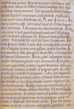 The Annales Xantenses or Annals of Xanten are a series of annals which adapt and continue the Royal Frankish Annals. Their first editor, Georg Pertz, thought they were perhaps written at the monastery at Xanten, hence their name. However, according to Heinz Löwe, the entries from 790 to around 860 were probably written at Lorsch by Gerward, a royal chaplain.[1] Löwe suggests that the manuscript subsequently passed to Cologne, and around 871 new entries were written there, for the years from 861 onwards. This part of the text is hostile to Archbishop Gunthar of Cologne.