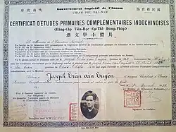 An Indochinese primary school completion certificate (Bằng-Cấp Tiểu-Học Cụ-Thề Đông-Pháp) issued by the National Ministry of Education of the Nguyễn dynasty in the year 1939. It has a modern French design but displays traditional symbols like the seal of the minister, and uses Classical Chinese alongside Romanised Vietnamese.