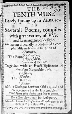 Bradstreet's first volume of poetry was The Tenth Muse Lately Sprung Up in America, published in 1650. It was met with a positive reception in both the Old World and the New World.[4][5]