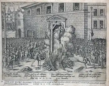 In 1559, after receiving a tip off, King Henry II attended a session of Parlement, during which he interjected to express his dissatisfaction at the progress against heresy.[1] One of those who rose to object was du Bourg, who obliquely critiqued Henri's infidelity in comparison to the purity of the Protestant community, arousing Henri's fury.[2] Several days later a special commission was established to try Anne and 5 colleagues in the Parlement.[2] The commission was keen to avoid executing their Parlement colleagues, but while the other accused Protestants were willing to recant and were let off with suspensions from Parlement, Anne refused to follow this route out.[3] He maintained his Protestant conviction, refusing to affirm the Real presence of Christ in the Eucharist.[3] Eventually on December 13 he signed an ambiguous confession of faith, avoiding execution, before renouncing it several days later, sealing his fate.[3] He would be executed at the Place de Greve on December 23, by strangulation and then burning.[4]