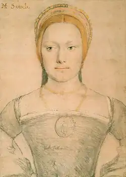 She was in the household of Anne Boleyn, as early as 1528 before the latter became the second wife of Henry VIII of England five years later. She served Anne Boleyn before and after her own marriage to Sir George Zouche of Codnor. According to one source, It was Anne to whom Anne Boleyn lent her proscribed copy of William Tyndale's The Obedience of a Christian Man.[1][2] After it was stolen in jest by her bethrothed, George Zouche, it fell into the hands of Cardinal Thomas Wolsey. After its return, Anne Boleyn persuaded the King to read the book.[1]