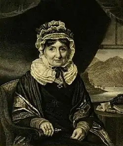 Her standing allowed Grant the rare luxury of being granted a pension from the Civil List in 1825.[26] In 1826, Grant removed her residence to Braehouse, a detached dwelling surrounded by a garden, which better suited her reduced mobility.[25] On 16 November 1827, Mary, her eldest and last surviving daughter, died. Of all her twelve children, only one remained, the youngest son. Her pupils, who loved her so well that they seldom left her home until called upon to establish households of their own, gathered often around her, and habitually showed her the most dutiful attentions. Her books, her school, legacies from deceased friends, and at last a literary pension, placed her late in life in easy circumstances.[25]