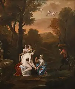 Scholars believe that Killigrew painted a total of 15 paintings. Both her poems and her paintings emphasize women and nature, and many of her paintings display biblical and mythological imagery. Several of her poems reference her own paintings, including "St. John Baptist Painted by her self in the Wilderness, with Angels appearing to him, and with a Lamb by him", "HERODIAS Daughter presenting to her Mother St. JOHN's Head in a Charger, also Painted by her self", and "On a Picture Painted by her self, representing two Nimphs of DIANA's, one in a posture to Hunt, the other Batheing."[12] A list of paintings, published for Admiral Killigrew's Sale in 1727, included "Venus and Adonis"; "Satyr Playing the Pipe"; "Judith and Holiferness"; "A Woman's Head"; and "Venus attired by the Graces".[14]