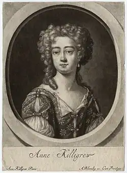 Anne Killigrew (1660–1685) was an English poet and painter, described by contemporaries as "A Grace for beauty, and a Muse for wit." Born in London, she and her family were active in literary and court circles. Killigrew's poems were circulated in manuscript and collected and published posthumously in 1686 after she died from smallpox at age 25. They have been reprinted several times by modern scholars, most recently and thoroughly by Margaret J. M. Ezell.[1][2]
