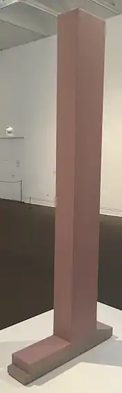 Truitt's first wood sculpture, titled First (1961), resembles a picket fence. It consists of three white vertical boards which come to a point—the pickets—which are braced from behind by a white post and two rails. The pickets, post, and rails are all attached to and visually grounded by a white base.[10] The forms contain memories of her past and her childhood geography, rather reflection of a "direct result of an empirical perception." First is a permeable memory of the idea of a fence, of all the fences Truitt has seen, instead of a fence modeled off of a specific image.[11] During a period spent in Japan with her husband, who at the time was the Japan bureau chief for Newsweek, she created aluminum sculptures from 1964 to 1967.[5] Before her first retrospective in New York she decided she did not like the works and destroyed them.[12]