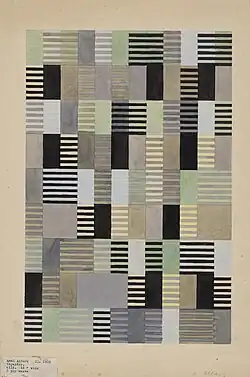 Albers was a designer who worked primarily in textiles and, late in life, with printmaking. She worked with multiple techniques, primarily lithography, embossing, silk-screening, and photo-offset.[33] She produced numerous designs in ink washes for her textiles, and occasionally experimented with jewellery design. Her woven works include many wall hangings, curtains and bedspreads, mounted "pictorial" images, and mass-produced yard material. Her weavings are often constructed of both traditional and industrial materials, not hesitating to combine jute, paper, horse hair, and cellophane.[34][35] Albers's early works, such as Drapery material (1923–26) and Design for Smyrna Rug (1925), display some of the characteristics that lasted throughout her career, notably her experimentation with colour, shape, scale and rhythm with abstract, crisscrossing geometric patterns.[36] Her work in printmaking was also experimental as she would "print lines multiple times, first positive then negative, [and print] off-register...She would explore the limits and possibilities of her tools."[33] To Albers, "there is no medium that cannot serve art."[33]