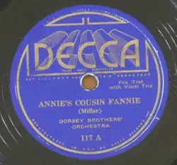 Annie's Cousin Fannie,[1] also released as "Annie's Cousin Fannie is a Sweetie of Mine", was written for the Dorsey Brothers Band in 1934 by Glenn Miller, who was an arranger and trombonist in the band. The composition featured double entendre lyrics.[2]