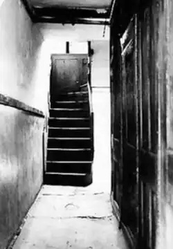 Annie Chapman's mutilated body was discovered shortly before 6:00 a.m. by an elderly resident of 29 Hanbury Street named John Davis.[54] Davis noticed that the front door was now open, while the back door was shut. Her body was lying on the ground near the doorway to the back yard, with her head six inches (15 cm) from the steps to the property.[55] Davis alerted three men named James Green, James Kent, and Henry Holland to his discovery, before all three ran down Commercial Street to find a policeman as Davis reported his discovery at the nearest police station.[56]
