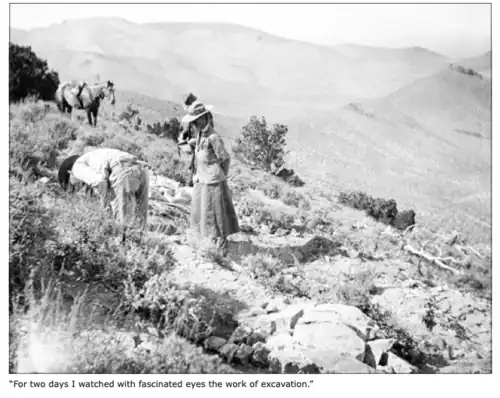 In 1905, she financed and took part in the Saurian Expedition to the West Humboldt Range in Nevada.[12] The expedition discovered many of the finest specimens of ichthyosaur. In 1905, Alexander financed and attended another expedition alongside John C. Merriam and his assistant Eustace L. Furlong. They headed 300 miles west to the West Humboldt Mountain Range located in northwestern Nevada. The expedition lasted only a few months but they returned with many of the finest specimens of ichthyosaur found at that time.[13] During many of her expeditions, Alexander kept a scrapbook containing photos of landscapes, participants, and fossil finds. In her scrapbook from the Saurian Expedition, Annie included photos of herself and Edna Wemple documenting their work in the field.[13]