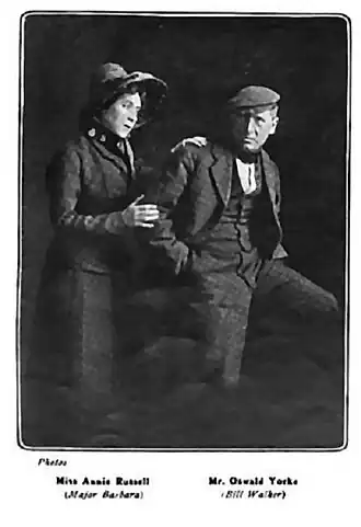 Annie Russell returned to London in 1905. Her first play upon her return was the role Barbara Undershaft in Bernard Shaw's Major Barbara in that same year, Shaw having written the part with Annie Russell specifically in mind.[49] Her husband Oswald Yorke played the part of Bill Walker in the same production. She later returned to the United States, appearing in Friend Hannah in 1906.[50] In the same year, she performed in A Midsummer Night's Dream at the newly built Astor Theatre in Boston.[51]