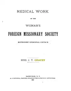 The history of the literature of the Woman's Foreign Missionary Society was closely linked with Gracey, serving as chairman of the committee on literature and creating missionary literature for the Society. As early as 1877, she saw the demand for a larger provision for this department, and the leaflets, booklets and reports that she wrote and produced make an impressive record. Under Gracey's direction, it developed from nothing to millions of pages annually. In her home, for years, she ran a "leaflet room" devoted to the Society's publications. Not only did she write many of the leaflets, but she also attended to the printing and mailing, sending every package herself for many years. The Study under her editorial charge became an established part in missionary education. An excellent record of woman's medical work in mission fields was written by her. Woman's Medical Work in Mission Fields, and she also published a book on Eminent Missionary Women, besides doing much general writing for various periodicals. As recording secretary of the General Executive Committee, a position she held for 223 years, she prepared the Annual Report of the Society, which required intimate knowledge of the details of the work and a lot of time in its preparation. She also furnished a quadrennial statement to the General Conference of the work in all parts of the world.[1]