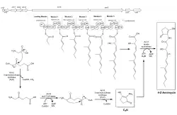 The biosynthesis of the C5N ring was recently reconstructed.[2] The ann2 gene encodes a 5-aminolevulinate synthase which condenses glycine and succinyl-CoA in a Claisen-like reaction to form 5-aminolevulinate. The ann3 gene produces acyl-CoA ligase and is predicted to activate 5-aminolevulinate as the CoA thioester, which subsequently undergo intramolecular cyclization with a carbanion generated at C5 to form C5N. The ann2 product is predicted to catalyze this cyclization using pyridoxal phosphate to stabilize the carbanion. The gene ann1 encodes an ATP-dependent amide synthetase and is predicted to condense the amine of the C5N group with the polyenoic acid product forming annimycin.
