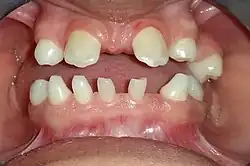 - ^ a b c d e f g h Rathee, Manu; Malik, Poonam; Dua, Madhuri; Yadav, Vikas (2016). "Early functional, esthetic, and psychological rehabilitation of preschool child with nonsyndromic oligodontia and anodontia in mixed dentition stage through conservative systematic approach: A case report with 5-year follow-up". Contemporary Clinical Dentistry. 7 (2): 232–235. doi:10.4103/0976-237X.183051. ISSN 0976-237X. PMC 4906870. PMID 27307674.