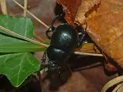 Adult dung beetles feed on feces and carrion.[7][11][12] They may also feed on litter mold, decomposing fungi and Phallus impudicus.[5]