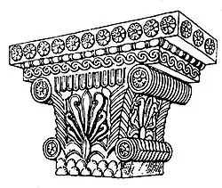 Some temples in Ionia tend to have a very different design of anta capital, flat at the fronts but with volutes on the side, giving them the shape of sofas, hence the name they sometimes take of "sofa capitals".[4] In this case the sides of the capital broaden upward, in a shape reminiscent of a couch or sofa.[5] This capital can also be described as pilaster capitals, which, strictly speaking, are normally decorative rather than structural components.[6]