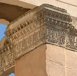 The Doric capital was designed in the continuity of the wall cornice. It is characterized by a broad neck, a beak molding and an abacus. The decoration is usually very sparse, except for the capitals displaying a transition with the Ionic order.[3]