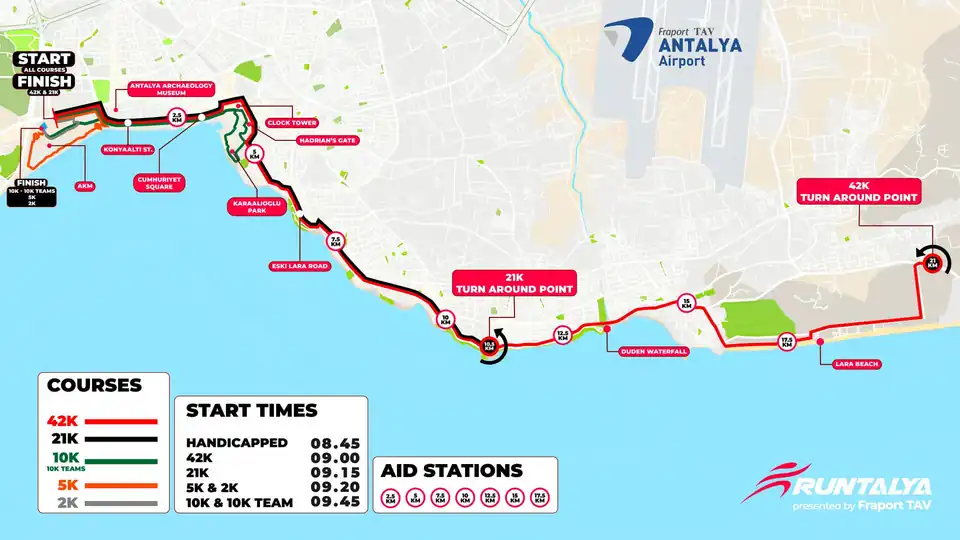 The course is a turning point route. The route runs from Atatürk Kültür Merkezi through the old city past Hadrian's Gate and Yivliminare Mosque and continues parallel to the stunning cliffy coast. All race categories end in Cam Piramit where Runtalya Village - event expo is located.