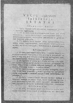 Besides his duties as commander, Bakšys also actively printed newspapers like Laisvės Varpas. He searched for alternative methods of resistance as he realized armed resistance of the partisans was becoming weaker and that the movement must incorporate intellectual means.[8] Bakšys consequently established the Vyčiai Union (Vyčių Sąjunga) in 1952. A newspaper entitled Vyčių Keliu was established as well.[10] The union was meant to retain the traditions of the LLKS and to unite legally living resistance members as well as partisans. Each group of active partisans was given the order to establish local unions, however, it was relatively difficult as there was intense anti-partisan activity and the resistance itself was much weaker than before, and consequently, the union could not establish significant influence. The Union's 1952 program, based on Lithuania's 1922 constitution, stated that "the further goal of the struggle is the defense of the nation's right to decide its own future destiny by choosing a new order and structure of the government apparatus and ensuring the conditions for rapid democratic cultural progress".[3][6] The union's statute also marks Lithuania's right to the regions of Vilnius, Klaipėda and part of Prussia. It also contained future industrial, agricultural, and educational reforms. The largest farms were supposed to be 30ha, and other lands would be confiscated in an attempt to fund small landowners and landless people. Education until 8th grade would be necessary, and importance would be placed on national culture and Christian values.[11] The union was dissolved after Bakšys's death.[2]