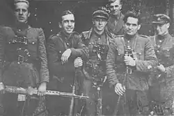 In 1947 Bakšys was arrested again. Bakšys was soon released, but could not stand a life of constant persecution and surveillance, and as such joined the Kęstutis military district. As Bakšys was older and more experienced, he was selected as the commander of the Vaidotas Territorial Unit. Due to his artistic competence, he was head of the unit's information division.[3][4] The unit was destroyed in 1949 along with its leader Juozas Čeponis-Tauragis, and the district's headquarters fell as well when its previous leader Aleksas Miliulis died. Thereafter, Bakšys shortly became the district's leader. He strictly enforced discipline and prohibited alcohol drinking. In 1951, he became the leader of the partisan Western Lithuanian region.[8] Bakšys was cautious as the partisan movement was already gradually weakening by the time Bakšys was the commander. He constantly switched deployment locations and avoided meeting partisan communicators. Despite that, Bakšys often inspected his partisans and maintained connections to the Union of Lithuanian Freedom Fighters president and partisan Jonas Žemaitis. When Žemaitis was sick, Bakšys wrote to other leaders to discuss potential new leadership candidates. Later on, he was appointed as Žemaitis' substitute[9] and secretary of the presidium.[2][3]