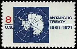 The Antarctic Treaty was signed on December 1, 1959 by the United States and eleven other nations involved in scientific research on the continent of Antarctica during the preceding biennium; seven of these nations – Argentina, Australia, Chile, France, New Zealand, Norway and the United Kingdom – had competing territorial claims to Antarctica.[1] From November 18 to November 19, 1968, the fifth consultative meeting of the state parties to the treaty was held in Paris.[2] During it, the issue of decennial commemorative stamps by the state parties who had signed the Antarctic Treaty was recommended.[3]
