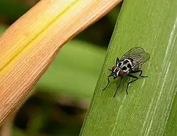 The Anthomyiidae are a large and diverse family of Muscoidea flies. Most look rather like small houseflies. Most species are drab grey to black. Many Pegomya are yellow, and some members of the genera Anthomyia and Eutrichota are patterned in black-and-white or black-and-silvery-grey. Most are difficult to identify, apart from a few groups such as the kelp flies that are conspicuous on beaches.