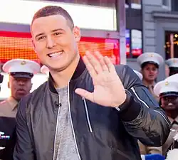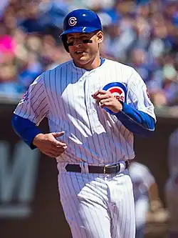 Rizzo started as the first baseman at the 2016 All-Star game, receiving the most fan votes in the National League.[45] By the end of the year, Rizzo had become one of three players, and the first left-handed player, in Cubs history to hit over 40 doubles and 30 home runs in the same year.[46] Rizzo played in 155 games with 583 at bats and scored 94 runs. He was hit by a pitch 16 times, had 170 hits with 43 doubles, 4 triples, 32 home runs and 109 RBIs. He finished the year with a batting average of .292 and was fourth in the voting for National League Most Valuable Player. Rizzo's fielding excellence was rewarded with a Gold Glove Award.[47] Rizzo was one of six finalists for the Marvin Miller Man of the Year Award[48] and was the Cubs nominee for the Roberto Clemente Award.[49] After an extremely slow start in the postseason, Rizzo broke out of his slump in the NLCS. He was an integral part of the last three victories over the Los Angeles Dodgers and led the Cubs to their first World Series appearance since 1945. In the 2016 World Series, Rizzo scored 7 runs and had 5 RBIs, and helped the Cubs win their first World Series title since 1908.[50] He also won the Esurance MLB Award for "Best Social Media Personality" and for "Best Play: Defense".[51] Rizzo's defense saved 11 runs for the Cubs which led all MLB first basemen and he was recipient of his first Fielding Bible Award and the Wilson Defensive Player of the Year Award.[52] He also won the fan vote for the Platinum Glove Award.[53] Rizzo took home two more awards for the year. One was the Silver Slugger;[44] It's awarded to the best offensive producers at each position in the field in both the American and National Leagues. It was Rizzo's first time receiving the award. The last one was the MLBPAA Cubs Heart and Hustle Award.[44] It was Rizzo's third time receiving the award from the Cubs organization.