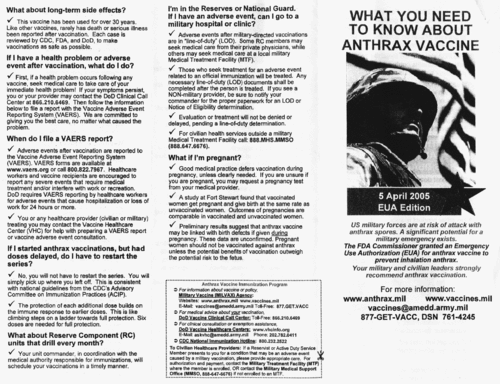 This is a pamphlet distributed to military members regarding their vaccinations after the Emergency Use Authorization from the FDA after April 4, 2005.