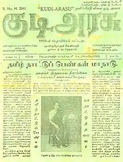 ![]() Front page of Periyar E. V. Ramasamy's periodical Kudiyarasu (3 September 1939). The headline reads "Veezhga Indhi" (Down with Hindi) | |||