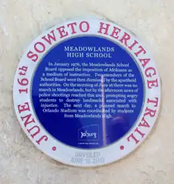 Plaque at Meadowlands High School opposing the imposition of Afrikaans as a medium of instruction