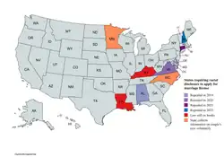 As of January 23, 2025, two states still require couples to declare their racial background when applying for a marriage license, without which they cannot marry. The states are Kentucky[49] and Louisiana.[50] In 2019, a Virginia law that required partners to declare their race on marriage applications was challenged in court.[51] Within a week the state's Attorney-General directed that the question is to become optional,[52] and in October 2019, a U.S. District judge ruled the practice unconstitutional and barred Virginia from enforcing the requirement.[53]