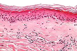 | Micrograph of subepithelial sclerosus (middle third of image) in a case of lichen sclerosus. H&E stain. | |