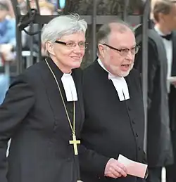 She was elected Archbishop of Uppsala on 15 October 2013 and was officially received in Uppsala Cathedral on 15 June 2014, in the presence of Carl XVI Gustaf of Sweden and Queen Silvia of Sweden, after the retirement of Anders Wejryd.[7] In March 2014, Johan Tyrberg was elected to succeed her as Bishop of Lund.