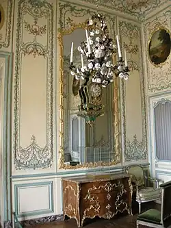 In one case, the identification of a royal commode permits the attribution to Gaudreau of several similar ones. The commode in question, formerly in the collection of Alphonse de Rothschild, was delivered by Gaudreau on 4 August 1738 intended for the King's bedroom at Château La Muette.[2] The gilt-bronze mounts, by which André Bouthemy attributed the commode to Charles Cressent,[3] who may have been responsible for modelling them. Several commodes following this model exist, including one in the Jones Collection at the Victoria and Albert Museum, London. One of the group bears on its gilt-bronze mounts the crowned C tax stamp that was used in 1745-49,[4] suggesting that the model remained current for several years.
