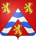 Gules, a chevron fess-wavy Argent and Azure of six pieces, acc. to three lions Or (arms of Mathieu Ruzé, taken over by Antoine Coëffier)[56][57] On these coats of arms, the chevron and orientation of the lions may be questionable. The coat of arms shown here is the most likely.[58]