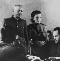 ![]() Former SS-Obersturmführer Anton Thernes in front of a penal court on trial for crimes he committed at Majdanek (standing left), 1944 | |