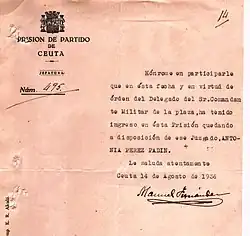 After several months in prison, Pérez was finally sentenced to death at the age of 39 in Ceuta on 17 November 1937.[1][4] She received two death sentences. The first was for belonging to International Red Aid's Ceuta branch. The second was for belonging to the Communist Party.[3][1] Her death sentence was in part because supporting these two organizations was seen as part of a wider imminent plot by communities to create a foreign, Soviet influenced revolution in Spain.[1] She was sentenced along with two other women, Andrea Maese Vázquez and Francisca Gutiérrez Hernández, for the same reasons.[1] Joaquina Garriga Mosquecho and Ana Sánchez González were two of the other five total women in Ceuta to receive death sentences that year.[1] They were the only five women in Ceuta to be given death sentences by Nationalist forces in the period between 1936 and 1942.[1] The death sentences were handed down without the benefit of a trial.[9] Her death sentence was later commuted to 12 years in prison.[6] She would spend the next eight years with time spread out between several prisons, including Sarchal Women's Prison in Ceuta, in Cádiz, in Burgos, and in Madrid.[3][1][4][10][5][6][7][11] She was in the Madrid prison in 1945.[12] In November 1945, a judge announced her release from the Madrid jail.[13] Pérez was never pardoned by the Spanish State.[14][2] Es:Penal de El Puerto de Santa María Es:Penal de El Dueso Es:Cárcel de mujeres de Ventas Pérez is one of the few women to have verified stories of sexual violence at Cárcel de Mujeres del Sarchal through her oral history.[1] While in prison, she witnessed a well-known local Falangist seeking sexual favors from another female prisoner, Antonia Céspedes Gallego. On 21 January 21, 1937, the Falangist appeared and took Céspedes from her cell, telling other prisoners "You are reds and one day I will come for some of you." While removing Céspedes from prison, the Falangist stabbed her in the back. A short time later, Pérez heard a gunshot outside the person. As Céspedes was being stabbed, she turned and screamed out to Pérez for help.[3][1][9][15]