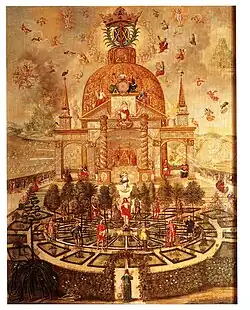 The painting is in the form of a triptych. The two outside panels depict the procession of the soul as the mystical bride of Christ. These open to reveal in two flanking panels a daytime scene of the finding of Moses in the Nile, and a night-time scene of the flight of the Holy Family to Egypt; and in the centre an immensely detailed systema totius mundi - a depiction of a philosophical system of the whole world.[4]