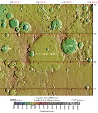 Antoniadi is a crater on Syrtis Major Planum in the Syrtis Major quadrangle, Mars, located at 21.5° north latitude and 299.2° west longitude. It is 394 km (245 mi) long and was named after Eugène Michael Antoniadi, a Greek astronomer (1870–1944) who spent most of his life in France.[1]