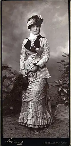 In 1875, Antonie resumed her career at the Burgtheater where she was one of the lead actresses of the company through 1882. She then spent the next decade performing in England and the United States as well as other theaters in Germany.[2] She made her Broadway debut in 1885 at the Madison Square Theatre in the title role of Anselma;[3] an English-language work created by Leander Richardson after Victorien Sardou 1873 French-language play Andréa.[4] She performed at the Burgtheatre once again in 1892–1893, and then retired from performance.[2]