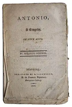 Antonio, or the Soldier's Return is an 1800 historical tragedy by the British writer William Godwin. It premiered at the Theatre Royal, Drury Lane on 13 December 1800.[1] The cast included John Philip Kemble as Antonio, Sarah Siddons as Helena, William Barrymore as Don Gusman, Richard Wroughton as Don Pedro, Charles Kemble as Don Henry, William Powell as Don Diego. Both the audience and critical reaction were negative.[2] Seven years later another of Godwin's plays Faulkener was staged at the same theatre.